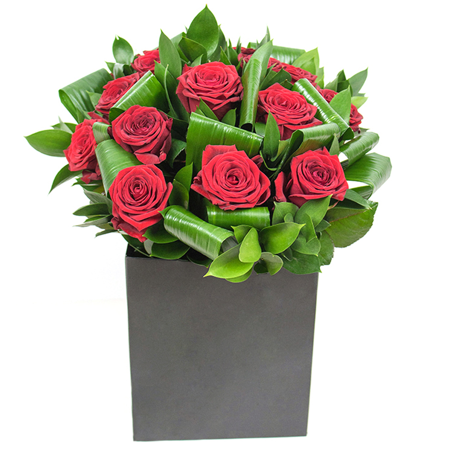 This opulent bouquet showcases the passionate allure of red roses, perfectly complemented by lush aspidistra leaves and refined ruscus. Designed to be a statement piece, this arrangement brings elegance and a touch of luxury to any setting.