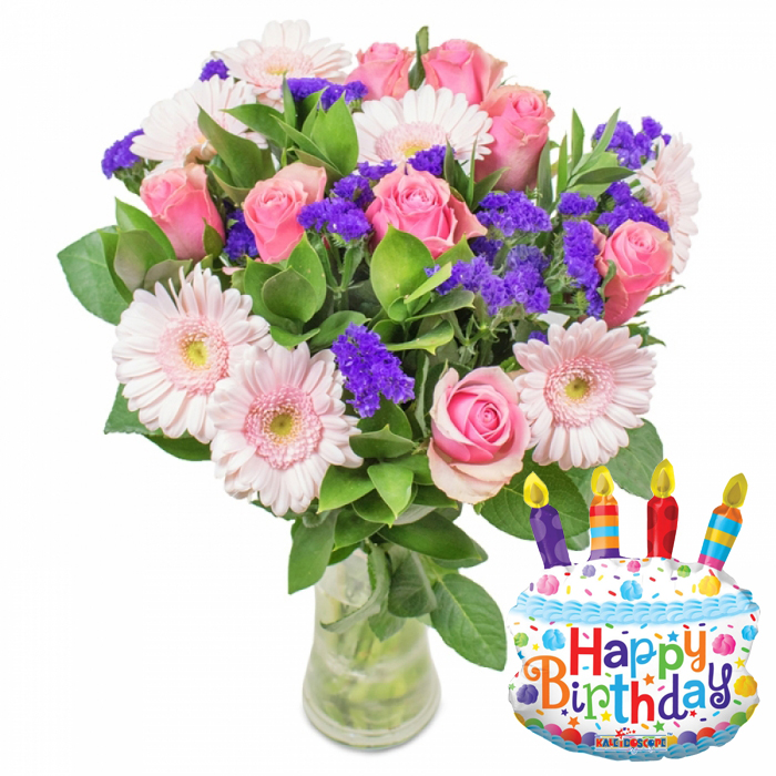 Express your heartfelt birthday wishes with our luxurious flower bouquet, featuring a vibrant balloon. This elegant arrangement blends pink roses, pink germinis, statice, and ruscus, creating a stunning visual display that adds beauty and sophistication to any birthday celebration.
