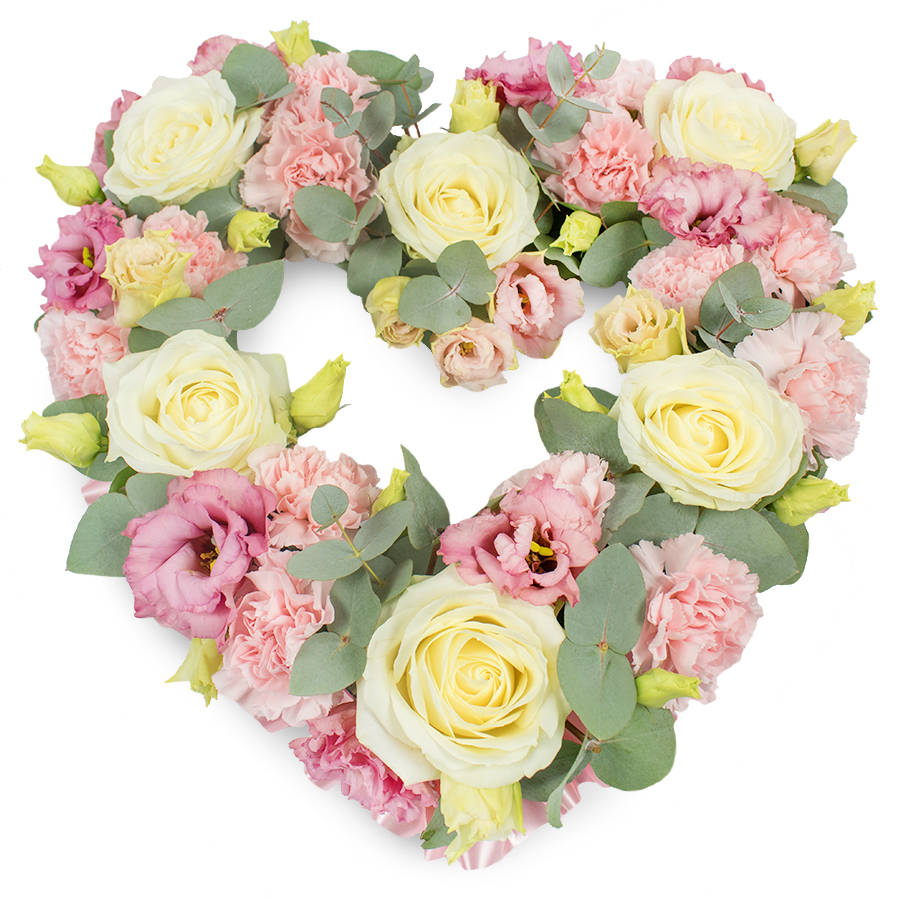 Express your deepest sympathies with our elegant open heart bouquet. This beautiful arrangement combines white roses, pink carnations, pink lisianthus, and eucalyptus leaves, all hand-selected to ensure maximum freshness and aesthetic appeal.