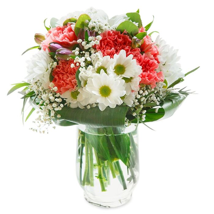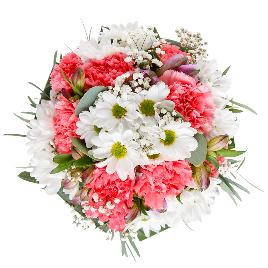 Express your sentiments with our timeless beauty bouquet. This arrangement features a graceful mix of snow-white chrysanthemums, delicate gypsophila, soft light pink carnations, and lush aspidistra leaves, all meticulously arranged to create a stunning visual masterpiece.