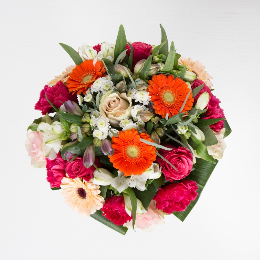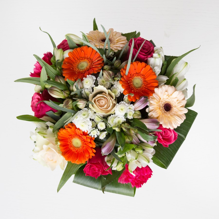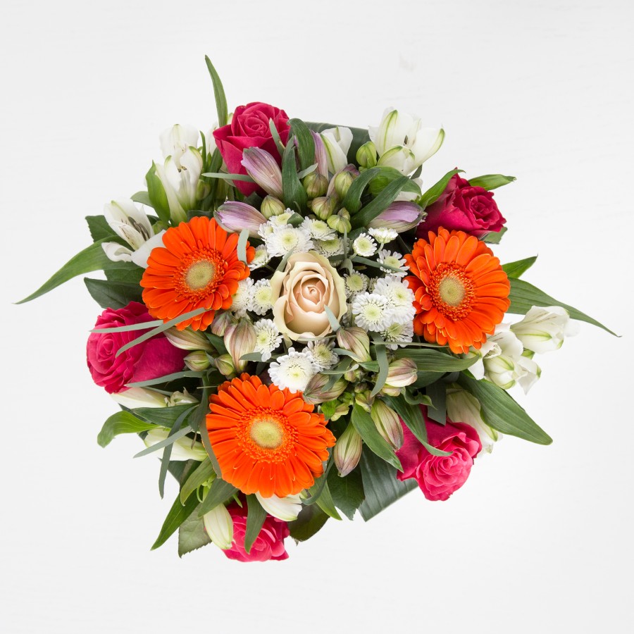 With its richness, this bouquet is inspired by the classic tones of the spring season. Irresistible orange burst and cream germini, pastel pink roses and carnations, white chrysanthemums and alstroemeria, complemented with aspidistra leaves wouldn't leave anyone indifferent.